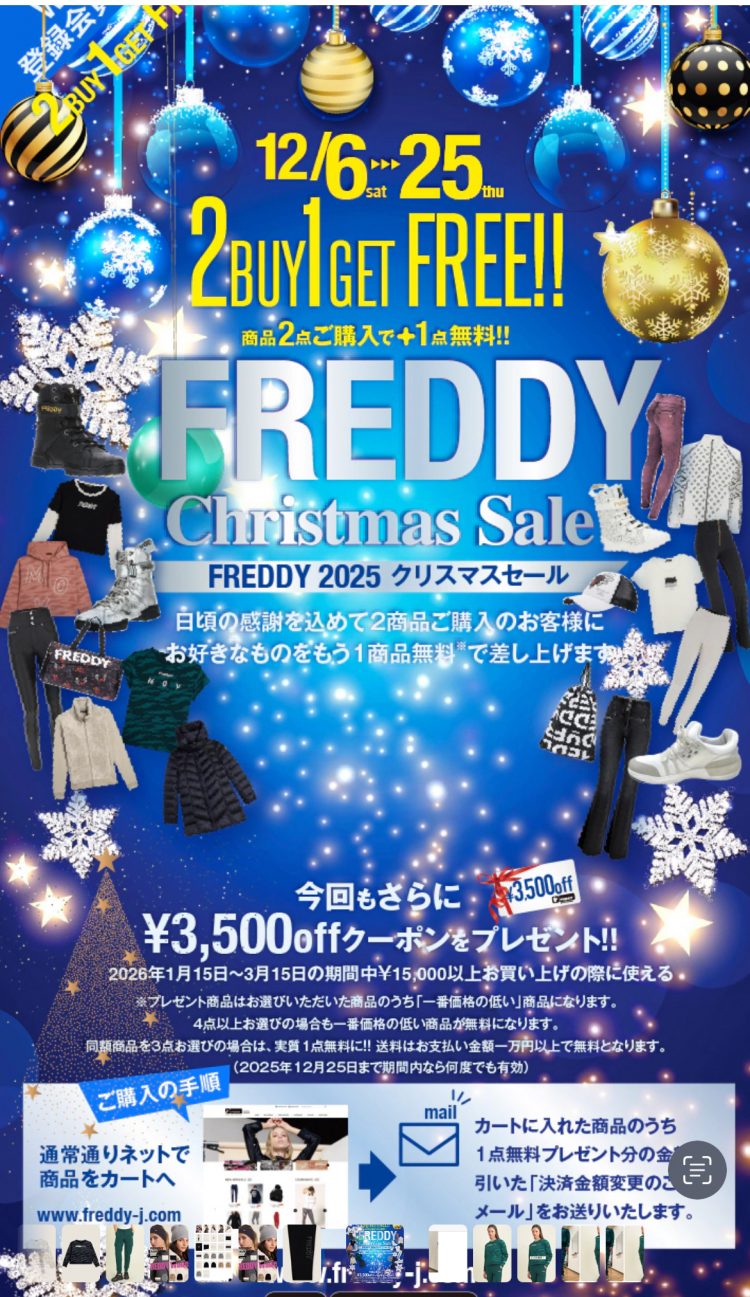 待ってました❤️ 今年も🎄Xmas🉐sale🎄 開催ですよぉ〜^_^ 🎅FREDDY 2025クリスマスセール🎄 2BUY1 GET FREE SALE!⭐️ 12/6(土)0:00~START! 3点購入でその中一番金額の低い商品が1点無料となります! (3点以上ご購入の場合も1番金額の低い1点のみ無料となります) 同額商品もOK! ...